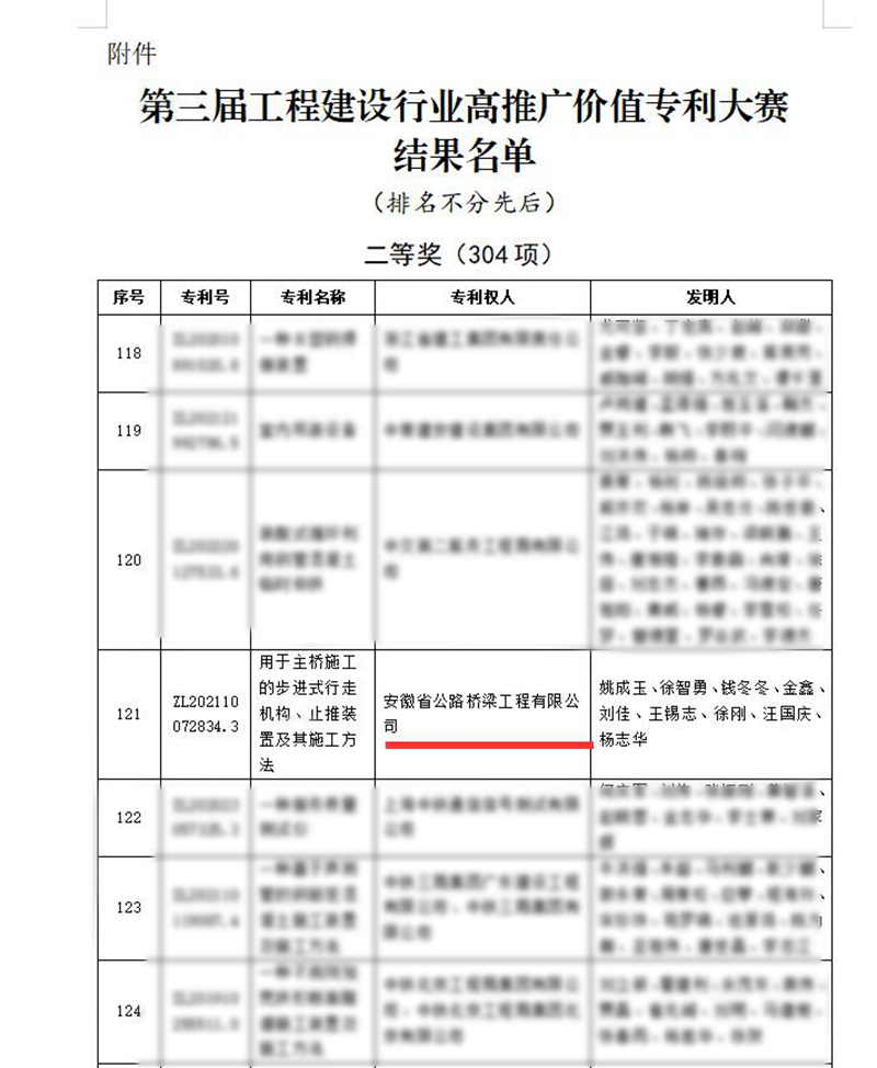近日,中國(guó)施工企業(yè)管理協(xié)會(huì)“第三屆工程建設(shè)行業(yè)高推廣價(jià)值專利大賽決賽”評(píng)選結(jié)果揭曉。由公司報(bào)送的《用于主橋施工的步進(jìn)式行走機(jī)構(gòu)、止推裝置及其施工方法》實(shí)用新型專利,在全國(guó)2498個(gè)參賽項(xiàng)目、19個(gè)復(fù)賽項(xiàng)目中脫穎而出,榮獲二等獎(jiǎng),實(shí)現(xiàn)了公司在該類別獎(jiǎng)項(xiàng)的新突破。