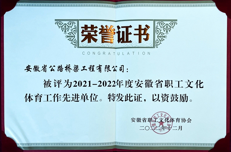 近日,安徽省職工文化體育協會發布了《關于表彰安徽省職工文化體育工作先進單位的通報》,授予安徽省公路橋梁工程有限公司等13家企事業單位“2021-2022年度安徽省職工文化體育工作先進單位”稱號。