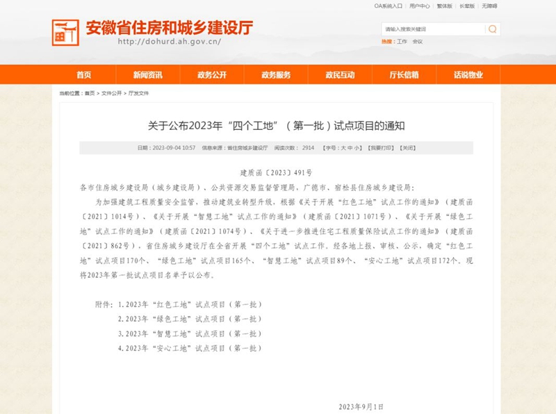 近日,安徽省住房和城鄉建設廳公布了2023年“四個工地”(第一批)試點項目名單,公司承建的多個項目在全省“四個工地”評比活動中脫穎而出,其中獲評“安心工地”項目3個,“紅色工地”項目4個,“綠色工地”項目4個,“智慧工地”項目1個。