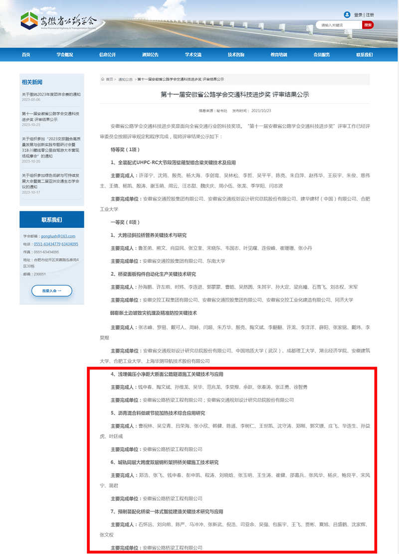 近日,2023年第十一屆安徽省公路學會交通科技進步獎評審結果揭曉,公司申報的《淺埋偏壓小凈距大斷面公路隧道施工關鍵技術與應用》等四項科研項目均獲安徽省交通科技進步獎一等獎。