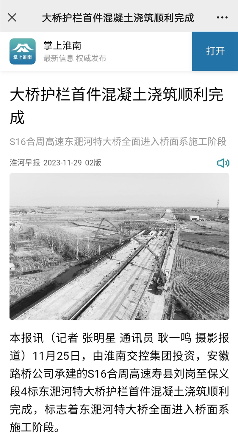 【名媒聚焦】學習強國、淮河早報、掌上淮南:S16合周高速東淝河特大橋全面進入橋面系施工階段