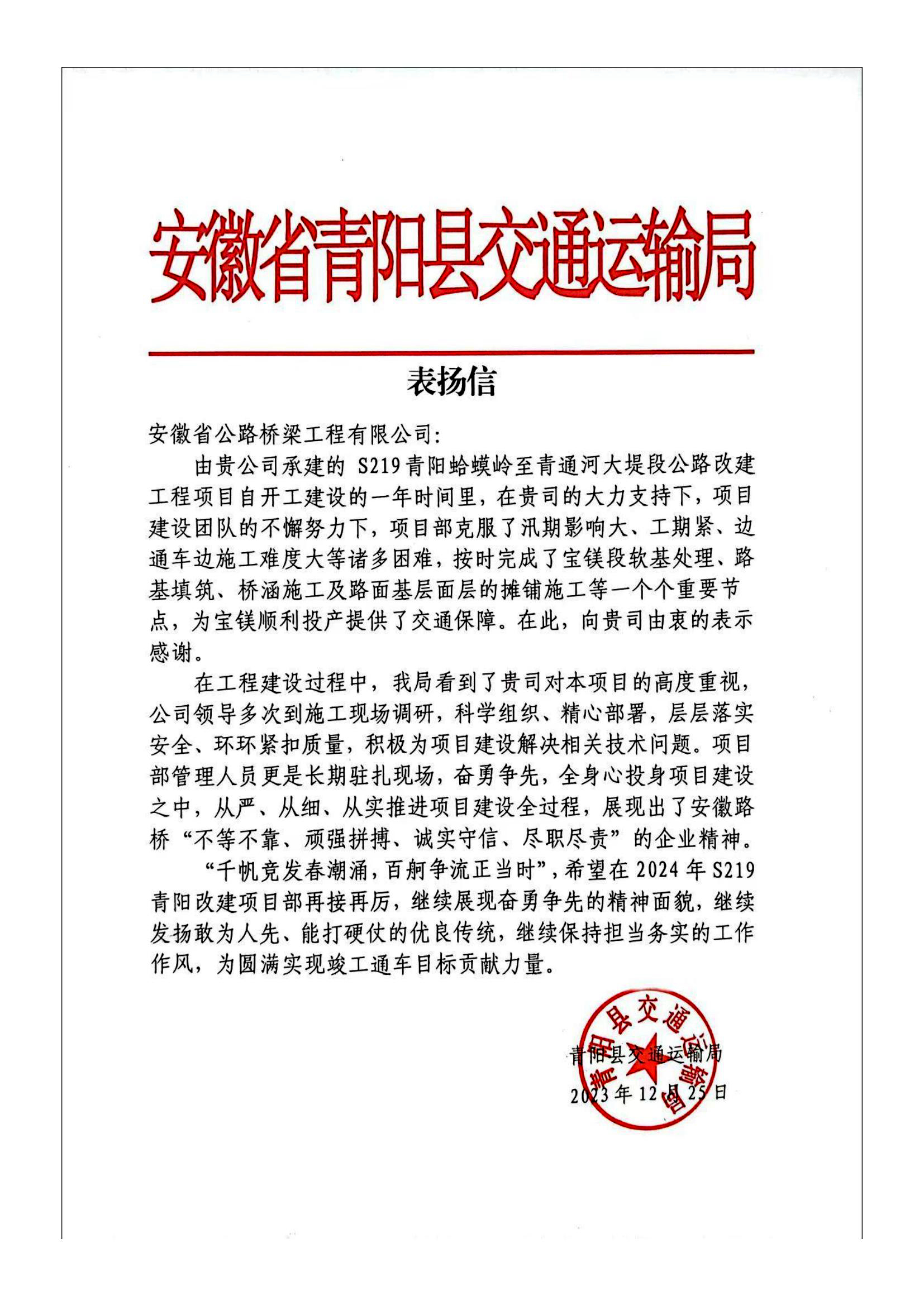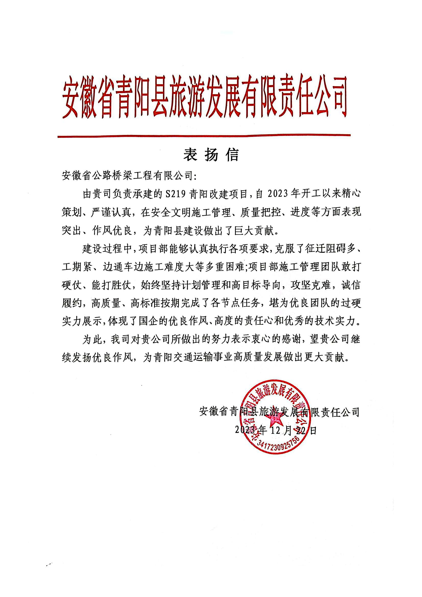 安徽省青陽縣交通運輸局和青陽縣旅游發展有限公司來信指出,S219青陽蛤蟆嶺至青通河大堤段公路改建工程項目建設過程中,項目施工管理團隊克服了汛期影響大、工期緊、邊通車邊施工難度大等諸多困難,高質量、高標準按期完成了各節點任務,為青陽交通運輸事業高質量發展做出了巨大貢獻。