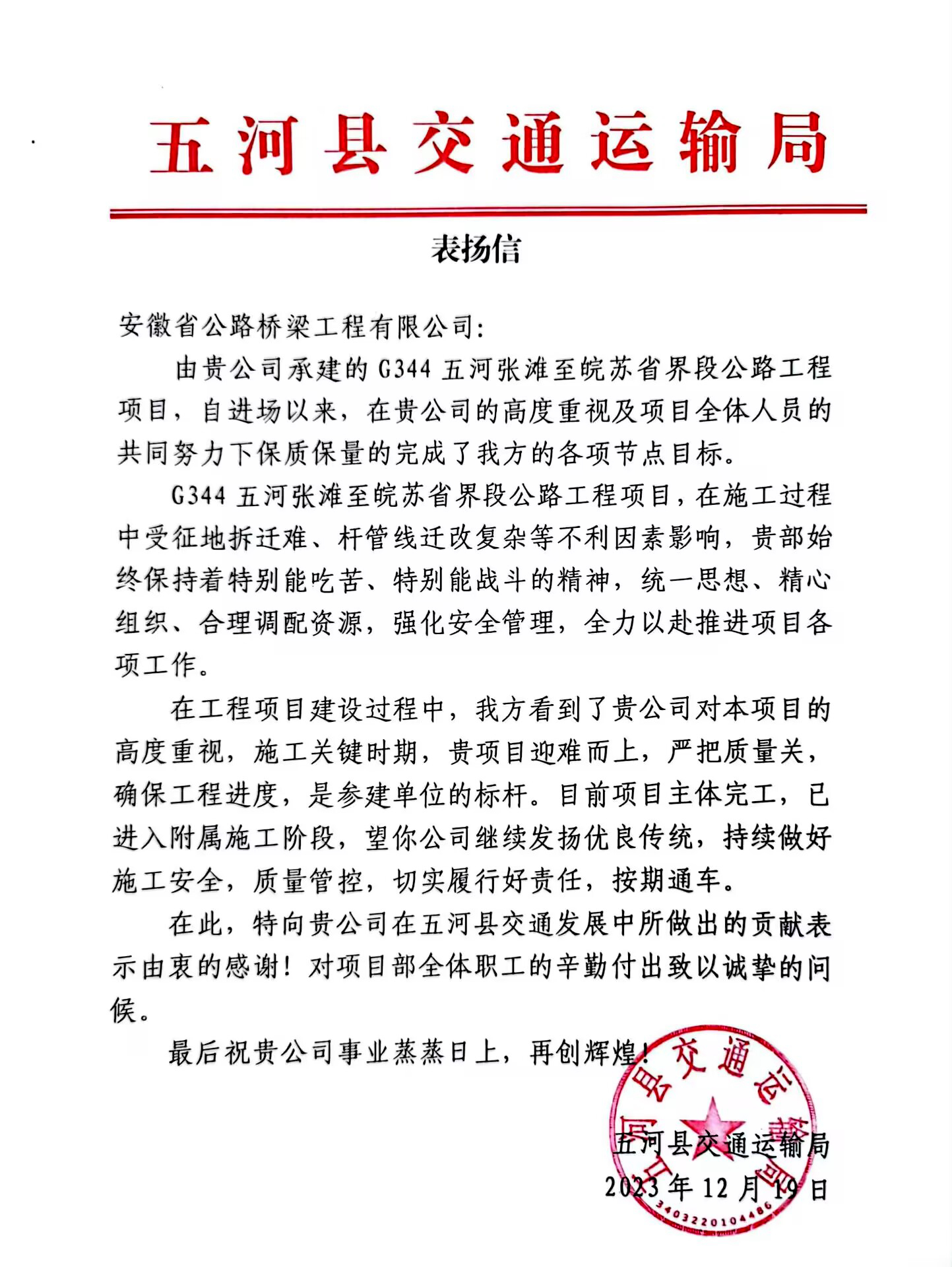 五河縣交通運輸局來信指出,G344五河張灘至皖蘇省界段公路工程自進場以來,項目全體參建人員統一思想、精心組織、合理調配資源,克服了征地拆遷難、桿管線遷改復雜等不利因素影響,保質保量地完成了各項節點目標,是全線參建單位的標桿。
