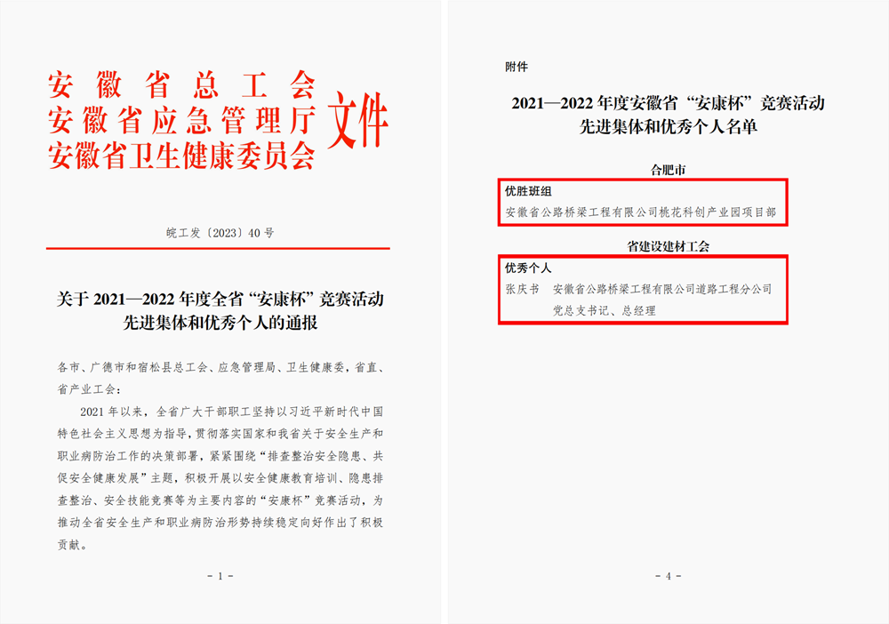 近日,安徽省總工會、安徽省應急管理廳、安徽省衛生健康委員會印發《關于2021-2022年度全省“安康杯”競賽活動先進集體和優秀個人的通報》,市政分公司桃花科創產業園項目部獲評“優勝班組”,道路分公司黨總支書記、總經理張慶書獲評“優秀個人”。