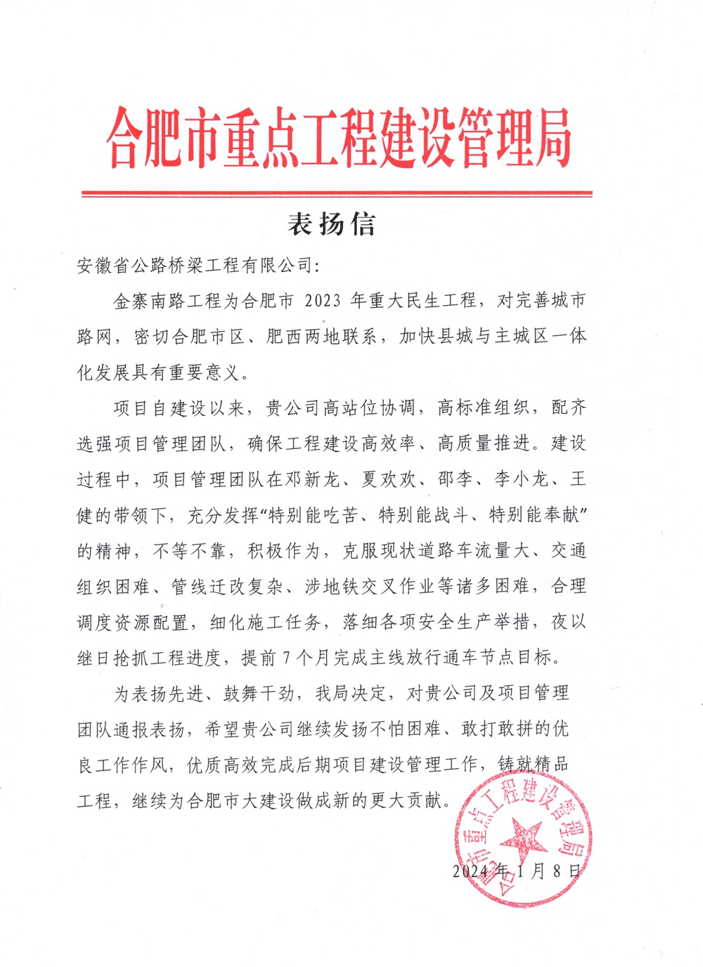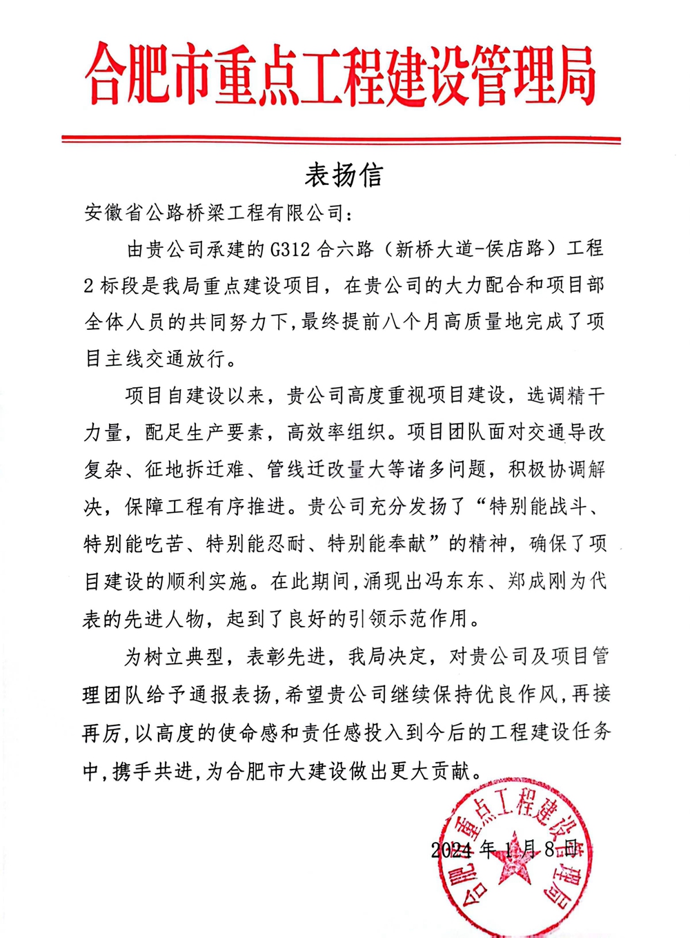 【載譽再出發】公司多個市政重點項目榮獲表彰(三) 發布時間:2024年01月09日 來源:市政分公司 發布人:黨委工作部 作者:周健 瀏覽:2861次 近日,公司承建的G312合六路(新橋大道-侯店路)工程2標、金寨南路快速化改造(望水路-站前路)項目、金寨南路快速化改造工程(站前路—深圳路)1標項目收到合肥市重點局來信表揚。 來信指出,G312合六路(新橋大道-侯店路)工程2標等3個項目在建設過程中,高站位協調,高標準組織,配齊選強項目管理團隊,確保工程建設高效率、高質量推進,圓滿完成了主線通車任務。同時對項目建設過程中涌現出的馮東東、鄧新龍、夏歡歡、鄭成剛、邵李、李小龍、王健等先進人物進行了表揚。