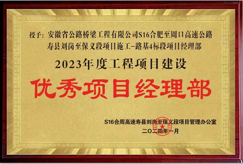 淮南交控(集團)有限公司S16合周高速壽縣劉崗至保義段項目辦發布2023年度“五比五看”評比得分通報,公司承建的S16合周高速4標東淝河大橋項目在全線脫穎而出,位列年度綜合考評第一名,獲通報表揚,并被授予“優秀項目經理部”榮譽稱號。