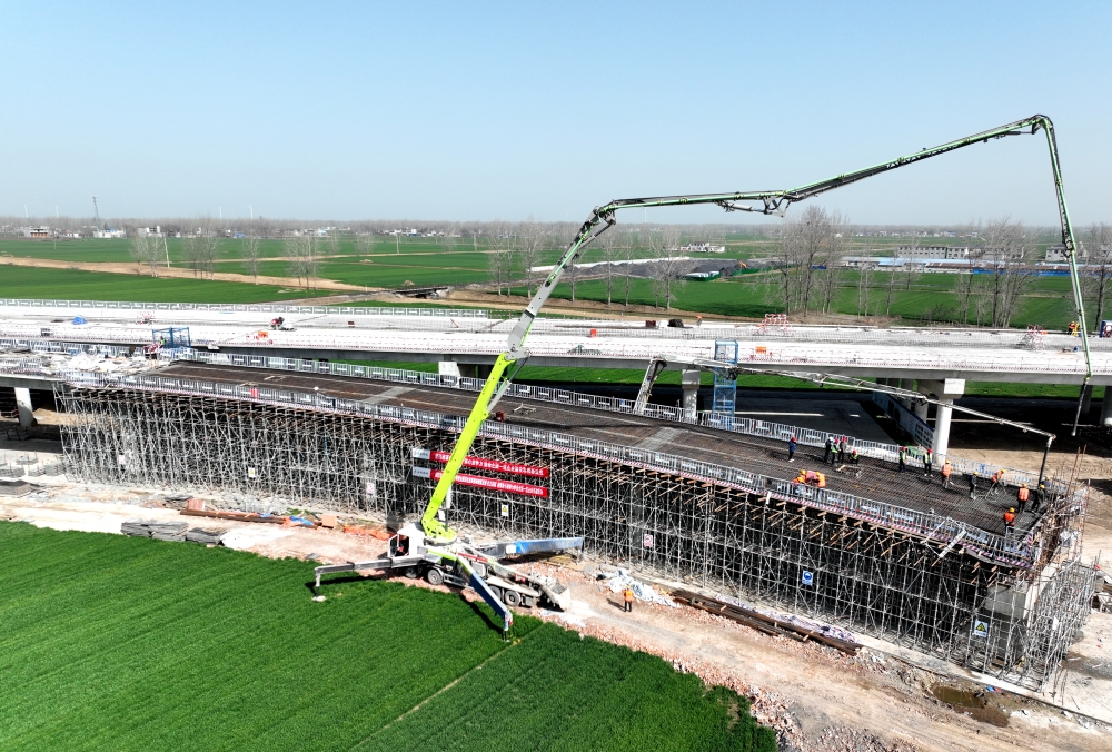項目部提前謀劃部署,搶抓施工黃金時段,迅速組織路基工作面備土,加強勞務隊伍、機械設備和物資材料保障,在保證安全質量的前提下,迅速投入到緊張的施工生產中。3月19日,順利完成渦陽互通DK0+233.949匝道橋第二聯現澆箱梁頂板澆筑,至此,標段內現澆箱梁全部完成澆筑。