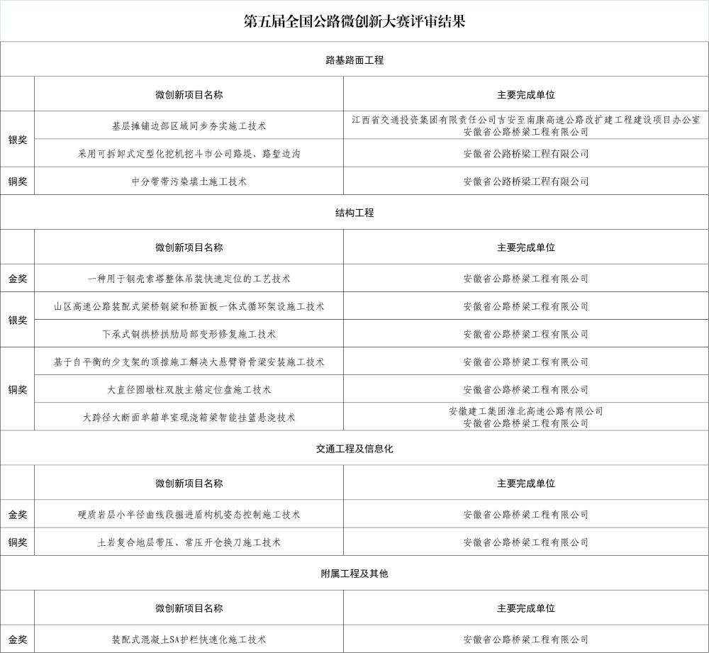 近日,中國公路學(xué)會公布了第五屆全國公路微創(chuàng)新大賽評審結(jié)果,公司《一種用于鋼殼索塔整體吊裝快速定位的工藝技術(shù)》《采用可拆卸式定型化挖機挖斗施工路堤、路塹邊溝》《中分帶無污染填土施工技術(shù)》等十余項微創(chuàng)新成果在眾多參賽項目中脫穎而出,分別榮獲金獎、銀獎、銅獎。
