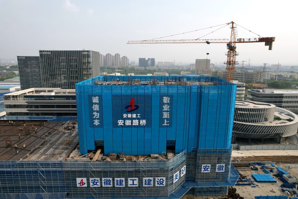 合肥新橋國際機場綜合交通中心項目施工現場,50余名管理人員、700余名工人、27臺各類施工機械緊密配合,全力推進項目合新六城際鐵路先行工程底板及交通中心負一層頂板施工,同時搶抓完成地鐵S1線非影響區最后一塊頂板。