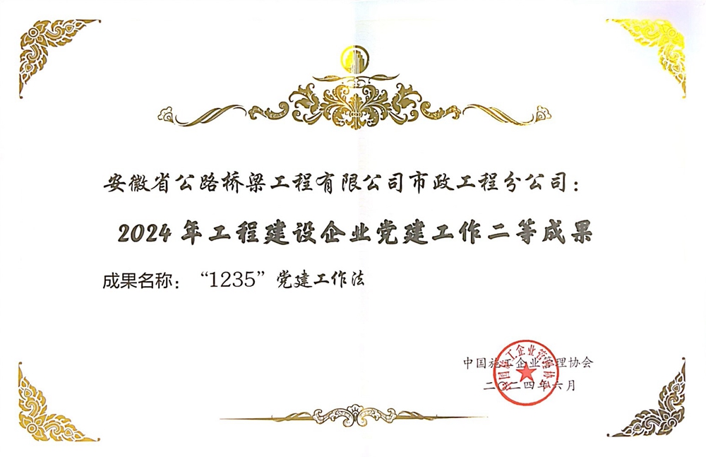 近日,中國施工企業管理協會公布2024年工程建設企業黨建工作優秀成果名單,公司“‘1235’黨建工作法”、“‘盾構黨建’品牌案例”獲評二等成果。