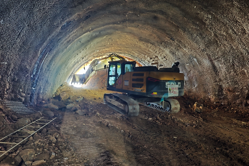 在江梓隧道左洞的內(nèi)部,也同時(shí)迎來(lái)了激動(dòng)人心的一刻。隨著挖掘機(jī)挖掘產(chǎn)生的巨大轟鳴聲在隧道內(nèi)回蕩,最后一塊巖石被精準(zhǔn)地挖掘開(kāi)來(lái),陽(yáng)光透過(guò)新開(kāi)的洞口灑進(jìn)隧道,照亮了這片黑暗的空間。工人們紛紛停下手中的工作,歡呼雀躍,慶祝這一時(shí)刻的到來(lái)。江梓隧道左洞的順利貫通,為項(xiàng)目后續(xù)耙齒嶺大橋梁板運(yùn)輸及安裝提供了有力保證,為整體工程的推進(jìn)奠定了堅(jiān)實(shí)基礎(chǔ)。江梓隧道右洞的施工也在緊張施工中,預(yù)計(jì)于8月份貫通。