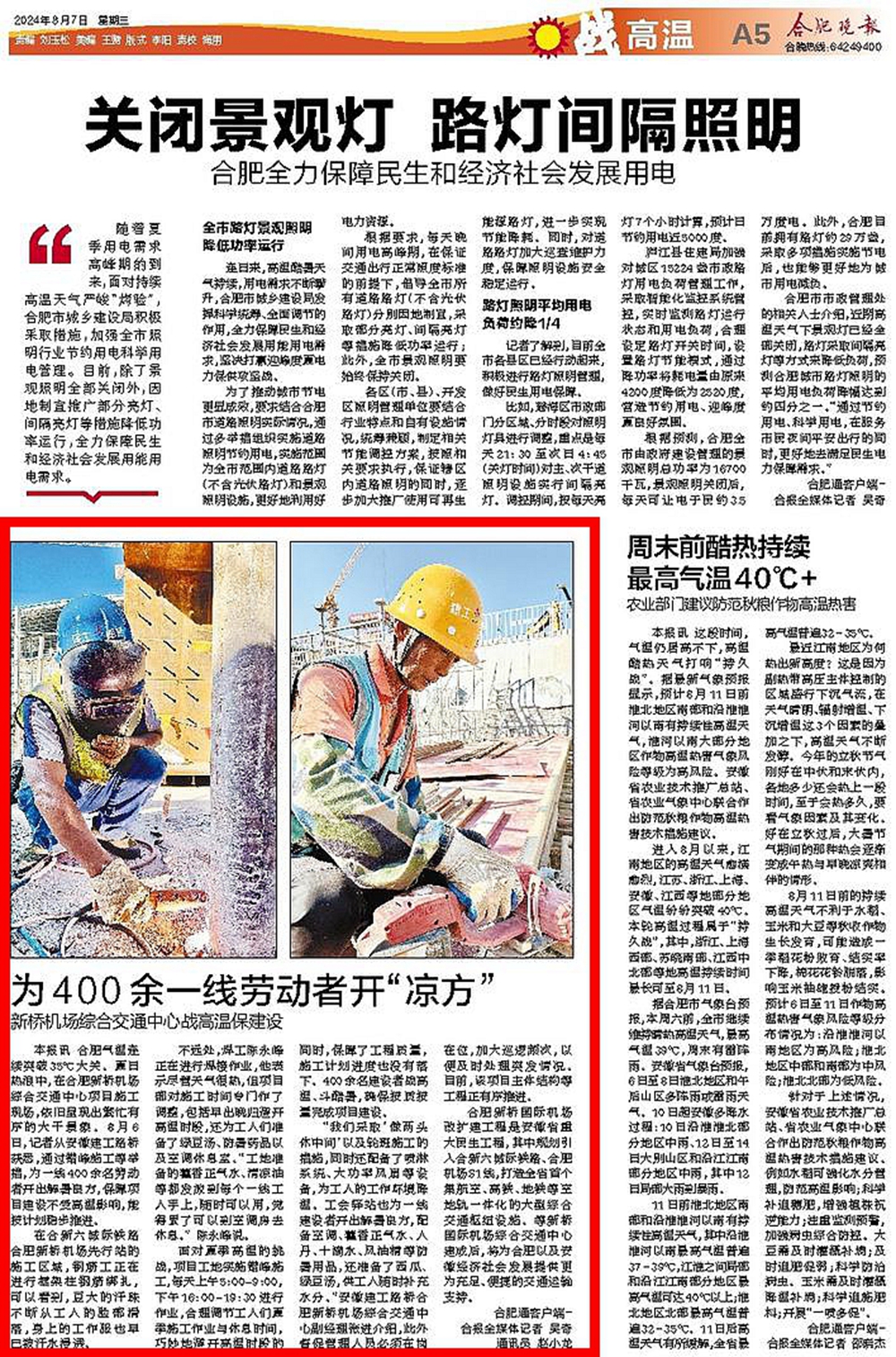 近日合肥氣溫連續(xù)突破35℃大關(guān)。安徽新聞聯(lián)播、安徽日報、合肥晚報等多家省市主流媒體深入報道安徽建工路橋合肥新橋國際機場綜合交通中心項目戰(zhàn)高溫、保生產(chǎn)。項目開出解暑良方,采取錯時施工、在作業(yè)區(qū)增設(shè)工業(yè)風(fēng)扇等措施,保障高溫天氣下勞動者生命安全和身體健康,確保這一重點工程建設(shè)的生產(chǎn)進度,保障項目建設(shè)不受高溫影響穩(wěn)步推進。