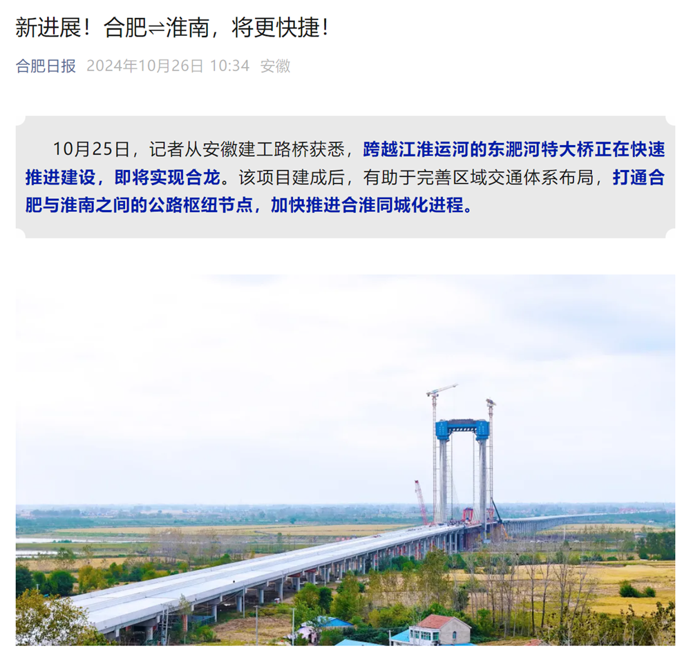 【名媒聚焦】安徽發布、合肥日報、淮河早報等主流媒體持續聚焦東淝河特大橋建設