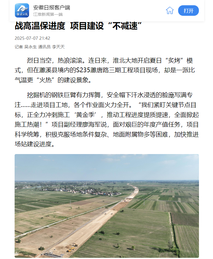【名媒聚焦】安徽日報:S235濉唐路三期工程項目——戰高溫保進度 項目建設“不減速”