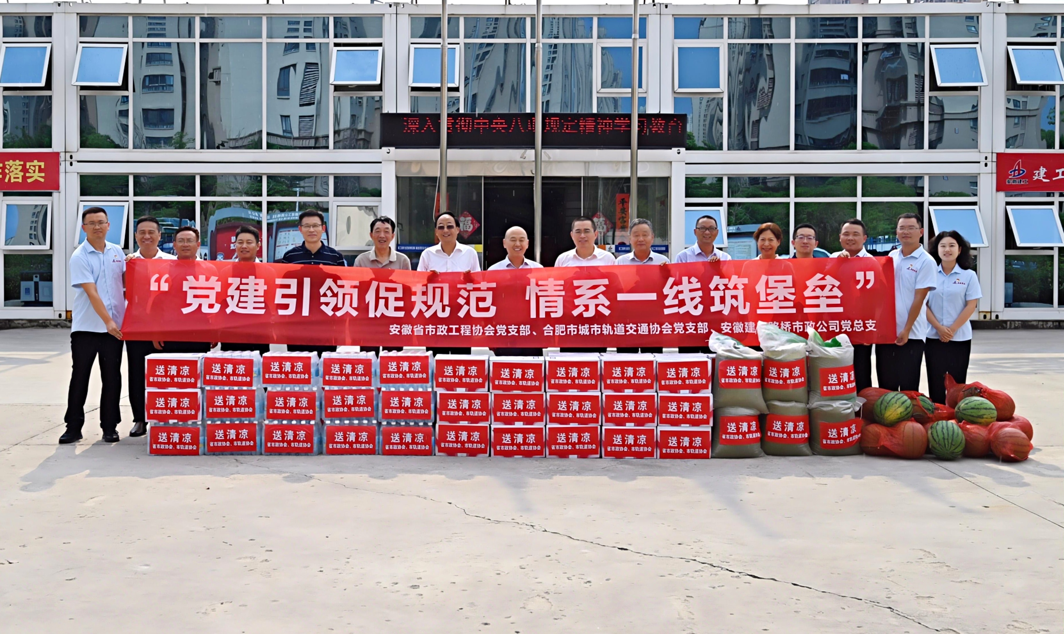 8月5號下午,安徽省市政工程協(xié)會黨支部書記、會長王斌,合肥市城市軌道交通協(xié)會黨支部書記、會長汪志成一行到合肥新橋機場S1線先行段項目開展“送清涼”慰問,向高溫下堅守崗位的項目職工致以誠摯的問候和深切的關懷,囑咐大家要科學統(tǒng)籌施工安排,落實防暑措施,在確保施工安全和工程質量的前提下,共同為如期完成目標任務努力。
