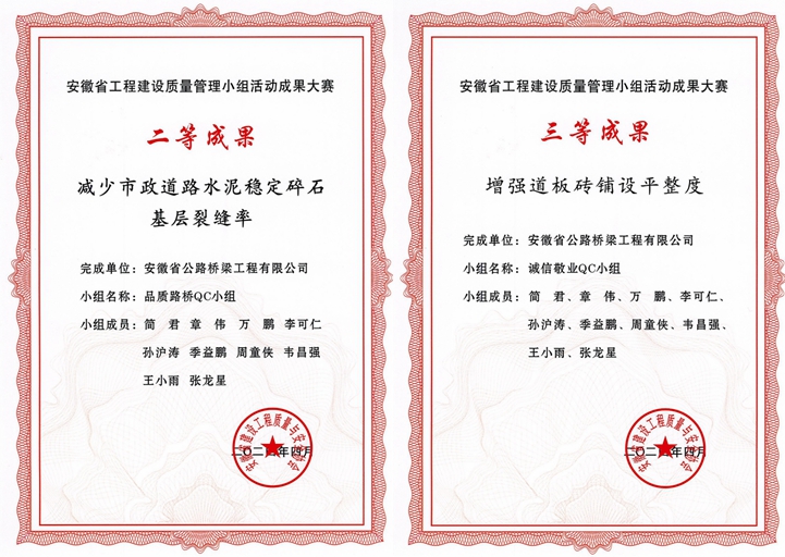 創新課題“積微成著”。憑借不同環境下的路基路面施工實踐,項目團隊持續開展技術攻堅和經驗萃取。在路面基層施工階段,通過嚴格控制石粉含泥量,成功避免水穩碎石基層裂縫,基層壓實度全面控制在96%以上;在附屬結構施工中,項目團隊對人行道板磚使用及鋪設進行改良,提升了路面觀感和行走舒適度。這些源于項目一線的創新案例,不僅提升了項目的建設質量和效率,更為后續的項目建設提供了寶貴的經驗借鑒。相關QC成果在安徽省建設質量管理小組成果大賽中分別獲得二等獎和三等獎。