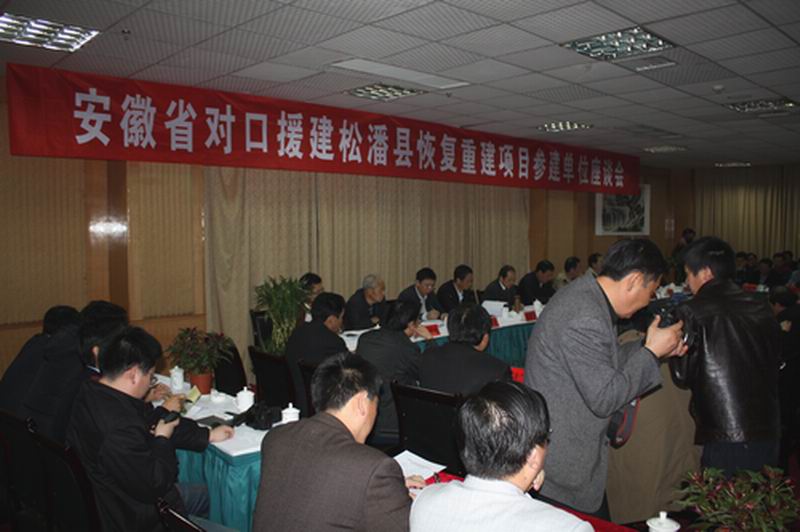 4月18下午,安徽省對口援建松潘縣恢復重建項目參建單位座談會在四川省阿壩藏族羌族自治州松潘縣太陽河國際大酒店召開。安徽省省長助理、省援建辦主任梁衛國,交通廳副廳長程躍輝,水利廳黨組成員、紀檢組長高玉寶、省經委總工程師李家壽、省國土廳處長夏炎以及省援建辦有關人員,四川省建設廳副廳長王衛蘭、省國土廳調研員張明旭、阿壩州副州長李川以及各參建施工單位、監理單位、設計單位代表參加了會議。公司總經理汪衛東、副總經理盛明宏也參加了座談會。會議由省援建辦副主任管早臨主持。