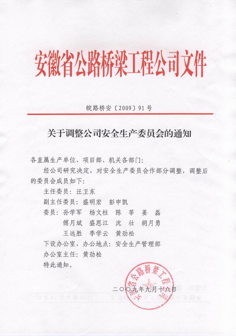 關于調整公司安全生產(chǎn)委員會的通知