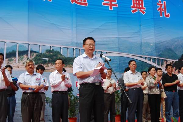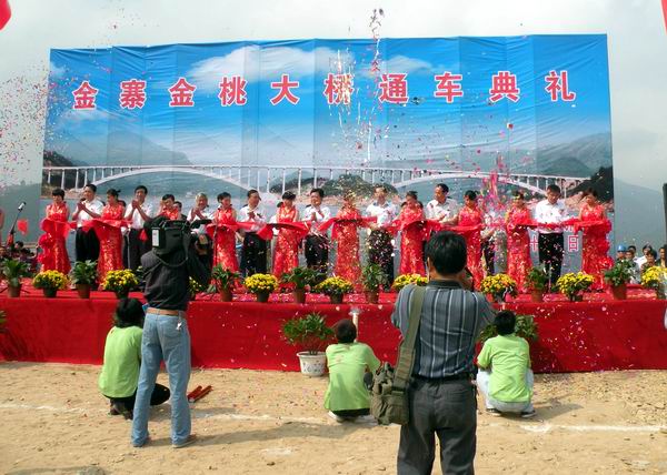 10時(shí)28分典禮正式舉行,來(lái)自兩岸的數(shù)千名群眾見(jiàn)證了這一激動(dòng)人心的時(shí)刻。省交通運(yùn)輸廳廳長(zhǎng)梅勁、省公路局局長(zhǎng)秦勤、省公路學(xué)會(huì)理事長(zhǎng)李永鐸、六安市副市長(zhǎng)楊光祥、金寨縣委書記沙洪虎、縣長(zhǎng)夏倫平和四大班子成員、金寨縣各個(gè)鄉(xiāng)鎮(zhèn)主要負(fù)責(zé)人等領(lǐng)導(dǎo)出席了通車典禮。典禮由金寨縣委副書記、縣長(zhǎng)夏倫平主持。來(lái)自我公司代表、金寨縣各單位代表共同組織了八個(gè)方陣參加了典禮。公司總經(jīng)理汪衛(wèi)東應(yīng)邀出席典禮,并參加了剪彩儀式。
