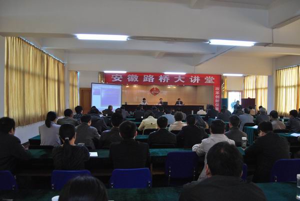 公司領導、項目部及分支機構領導、機關全體員工等一百多人參加了揭牌儀式和講座,揭牌儀式及講座由公司黨委書記陳光磊主持。公司總經理汪衛東在揭牌儀式上發表了重要講話。汪總首先對戴總在百忙中抽空為安徽路橋大講堂啟動授課表示衷心的感謝,隨后汪總從實現公司十二五發展戰略規劃及加強公司人力資源開發和培訓工作兩方面闡述了安徽路橋大講堂開辦的重要意義。汪總強調指出通過大講堂這一平臺的建設,將進一步提升公司管理人員的管理能力和技巧,更新管理理念和思路;加強各類專業技術人員的交流與學習,推廣新技術、新經驗;并通過宣貫公司戰略規劃和企業文化理念,進一步統一員工的思想,促進共同價值觀的形成。汪總還對安徽路橋大講堂的組織者和所有參與者提出了具體的要求。