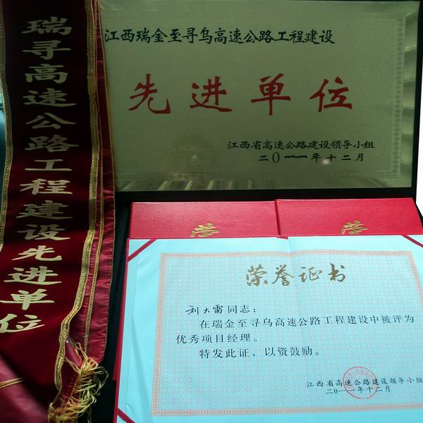 公司承建的瑞尋A7標(biāo)在公司的正確領(lǐng)導(dǎo)下,在以劉大雷同志為首的項(xiàng)目全體員工的共同奮斗下,經(jīng)過(guò)兩年的頑強(qiáng)拼搏、艱苦施工,終于實(shí)現(xiàn)了瑞尋高速公路的建成通車,在贛南大地描繪了一條絢麗的彩虹,書寫了一幅質(zhì)優(yōu)、安全、廉潔、環(huán)保的壯麗畫卷。瑞尋A7標(biāo)以工程質(zhì)量更優(yōu)、外觀形象更美、生態(tài)環(huán)境更佳、依法管理更嚴(yán)、安全廉潔更好為要求,以抓細(xì)節(jié)、樹(shù)精品、講程序、促規(guī)范、善創(chuàng)新、爭(zhēng)一流為管理理念,取得了一系列的優(yōu)異成績(jī)。在項(xiàng)目辦的兩次階段評(píng)比中均獲得A段第一,全線第二名的好成績(jī),還獲得了業(yè)主頒布的“先進(jìn)單位”稱號(hào),項(xiàng)目經(jīng)理劉大雷獲得了瑞尋項(xiàng)目“優(yōu)秀項(xiàng)目經(jīng)理”稱號(hào),項(xiàng)目總工戴聲慶、副經(jīng)理鳳爾飛、王星輝和黃明明四人獲得了“先進(jìn)個(gè)人”稱號(hào)。