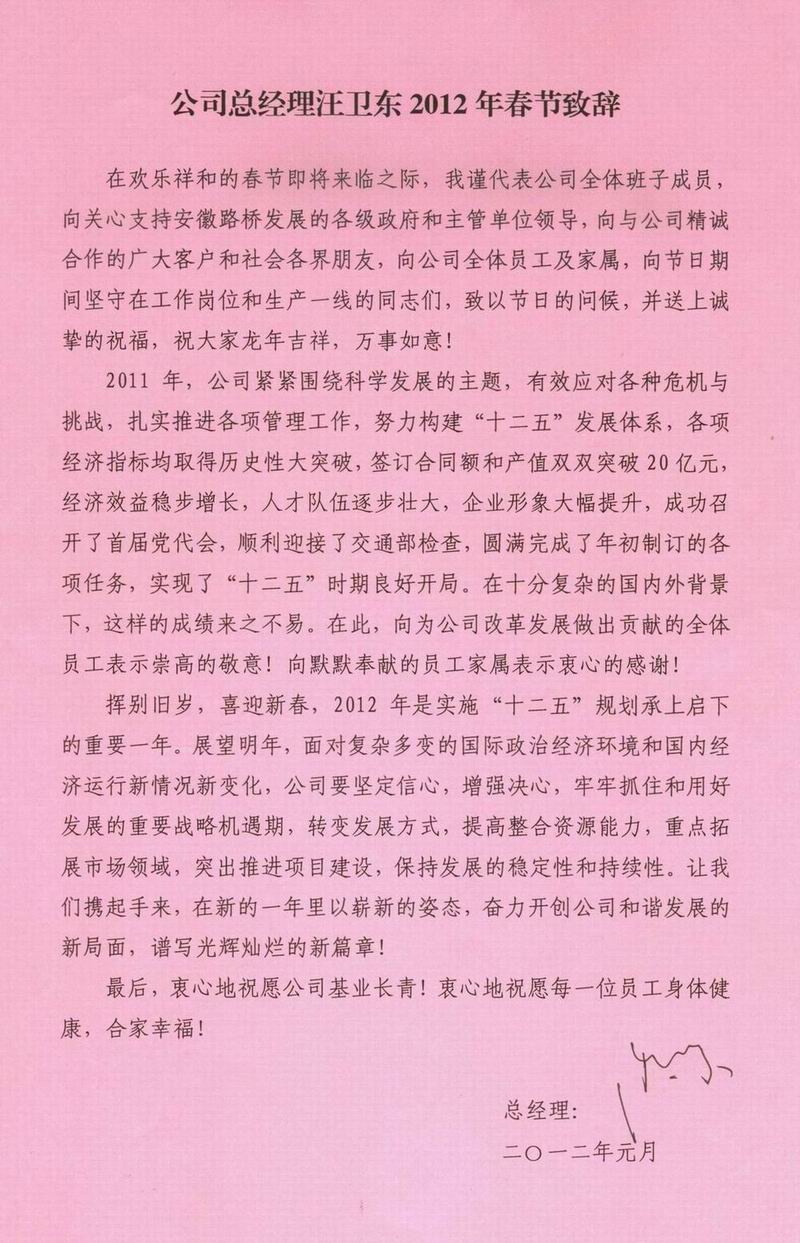 公司總經(jīng)理汪衛(wèi)東2012年春節(jié)致辭