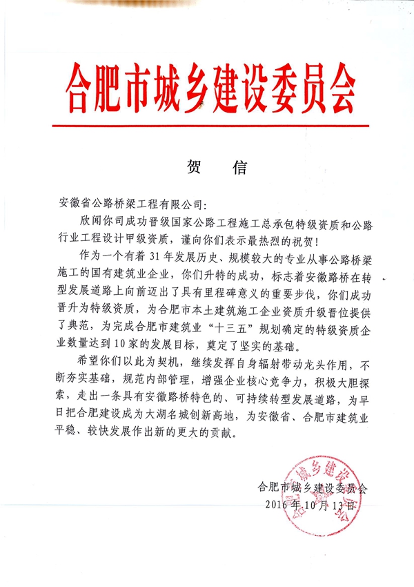 近日,合肥市城鄉建設委員會向公司發來賀信,熱烈祝賀公司晉升國家公路工程施工總承包特級資質和公路行業工程設計甲級資質。