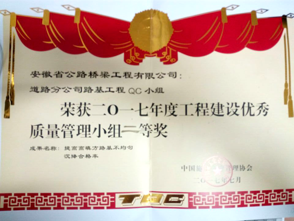 近日,在中國施工企業協會2017年度全國工程建設質量QC小組成果發布暨評審會上,由道路分公司QC小組選送的《提高高填方路基不均勻沉降合格率》成果,從全國千余個QC成果中脫穎而出,以優異的成績榮獲2017年度工程建設優秀質量管理小組成果二等獎,為公司贏得了榮譽。
