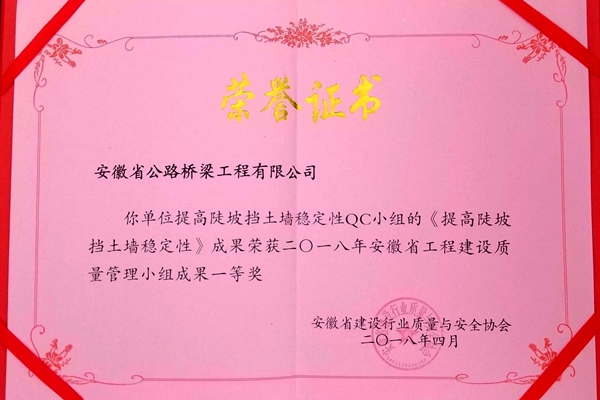 其中,合寧05標申報的《確保鉆孔樁灌注I類樁100%合格率》和《提高橋梁防撞護欄鋼筋保護層合格率90%以上》分別榮獲一、二等獎;由績溪S456項目申報的《提高陡坡擋土墻穩定性》榮獲獲一等獎。