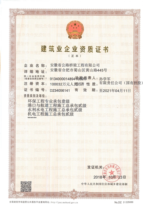 10月23日,公司環保工程專業承包壹級、水利水電工程施工總承包貳級、機電工程施工總承包貳級三項資質順利通過安徽省住房和城鄉建設廳審查核準。三項新資質的取得為公司進一步拓展非公路施工業務,實現經營業務多領域發展打下了基礎。