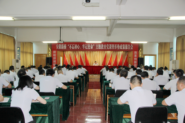 為進一步推深做實“不忘初心、牢記使命”主題教育,按照公司主題教育方案部署,8月2日下午,股份公司副總經理、公司黨委書記、董事長孫學軍以“守初心 擔使命 找差距 抓落實——用習近平新時代中國特色社會主義思想指導打造品質路橋卓越路橋”為主題,作了一場主題教育黨課暨形勢政策報告會。集團主題教育第四指導組副組長王永來到會指導。公司領導,中層干部,在肥項目經理、黨支部負責人,機關全體黨員100余人參加了報告會。