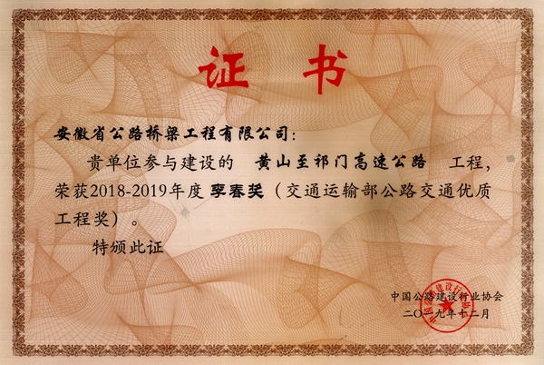 近期,由中國公路建設(shè)行業(yè)協(xié)會(huì)組織的“全國公路高質(zhì)量發(fā)展云端論壇”正式落幕。期間,以網(wǎng)絡(luò)形式頒發(fā)了2018-2019年度李春獎(jiǎng)。公司參與建設(shè)的“黃山至祁門高速公路”工程榮獲李春獎(jiǎng)。