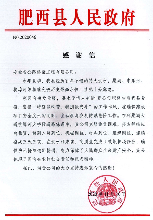 11月10日,肥西縣人民政府給公司送來一封感謝信,高度贊揚公司在防汛搶險工作中的突出貢獻和國企擔當精神,并向公司致以衷心感謝。