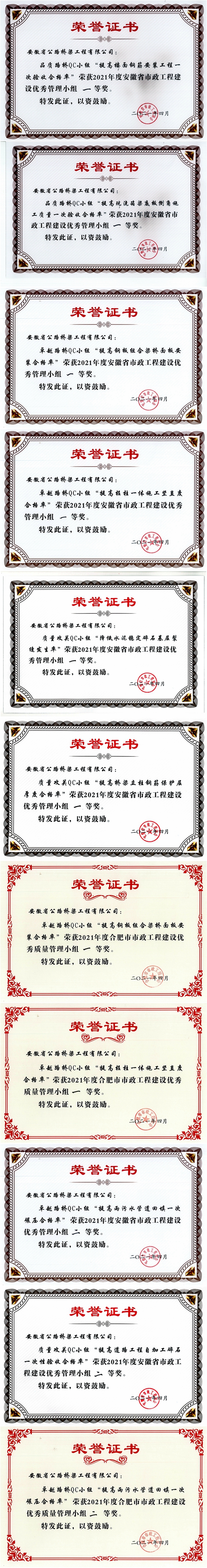 2021年度市政工程建設優秀QC小組活動成果共申報15項,獲得安徽省市政工程優秀QC小組一等獎9項、二等獎6項,獲得合肥市市政工程優秀QC小組一等獎9項、二等獎6項;同時公司榮獲“安徽省市政工程QC優秀企業”和“合肥市政工程QC優秀企業”。