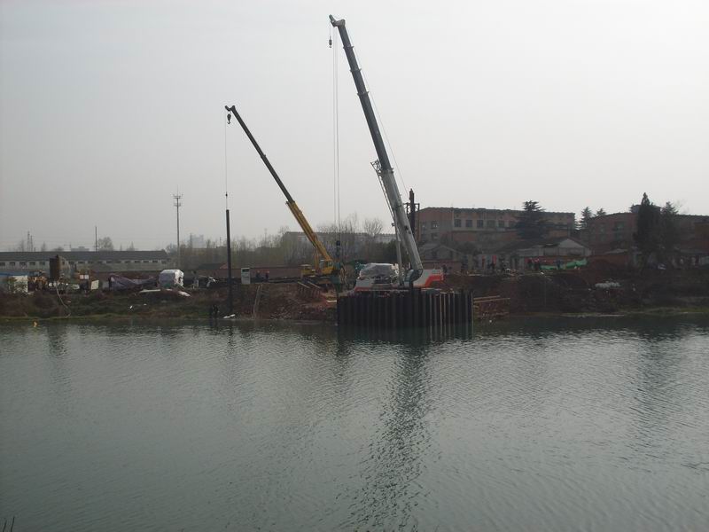 淠望路大橋作為市政工程具有工期緊、任務重、技術難度大的特點,但經項目部領導精心組織、科學部署,加大人力與設備的投入,自2月1日進場開工以來,全部90根挖孔樁已開挖41根,累計深度270m;于2月18日開始進行關鍵工序——主墩右幅鋼板樁圍堰施工。由于淠史杭干渠承擔皖豫兩省14個縣(區)的春耕灌溉任務,六安市重點辦要求加快施工進度,必須在4月15日完成所有水下工程及用于水面以上施工的支撐等,并于4月25日前完成圍堰拆除清理工作。項目部立即召開緊急動員會,號召全體技術人員克服一切困難和挑戰,堅決完成上級交代的任務,并立即組織技術人員根據鋼板樁長度、水深、地質、承臺埋置深度等情況,制定了科學的施工技術方案、成立了以項目部經理、副經理為組長的安全領導小組。施工所用的T90振動錘、70t吊車、25t吊車、PC200挖機、 T100推土機、ZLM50裝載機、自卸車等重型機械設備陸續開進施工現場。