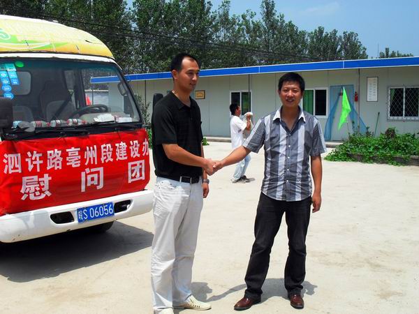 安徽交投集團泗許高速亳州段建設辦到泗許01標慰問 發布時間:2009年07月29日 來源:泗許01標 發布人: 作者:章玉潔 瀏覽:5438次 連日來,持續高溫,7月24日上午,交投集團泗許高速亳州段建設辦綜合部部長王文飛一行帶著綠豆等防暑慰問品,冒著烈日來到泗許項目01標進行慰問,讓我標段的所有員工在高溫一線倍感清涼。