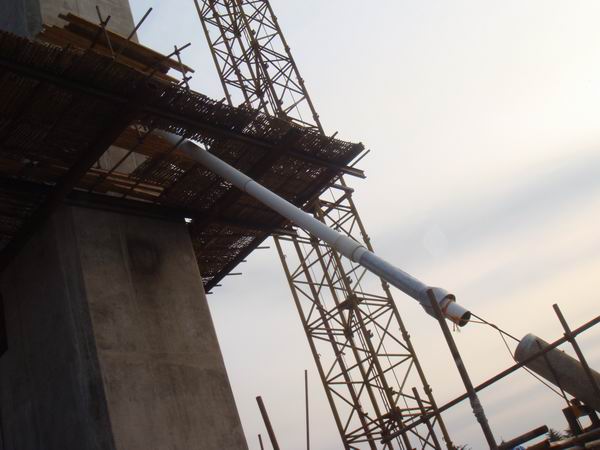 該斜拉索長(zhǎng)19.0米,重1噸,由43根鋼絞線組成。據(jù)悉,六安淠望路大橋主塔共有斜拉索60根,由高強(qiáng)度、低松馳的光面鋼絞線組成。單根鋼絞線直徑為15.2mm,標(biāo)準(zhǔn)強(qiáng)度fpk=11860Mpa。斜拉索采用三層防護(hù):第一層涂油脂或石蠟,第二層為單根鋼絞線熱擠單層PE層,第三層整體索外包HDPE雙層護(hù)套。主塔的左、右幅索塔各布置了15對(duì)斜拉索,最大索長(zhǎng)123.0米,重12噸,由73根鋼絞線組成。 整個(gè)斜拉索施工計(jì)劃到2010年4月份完成。