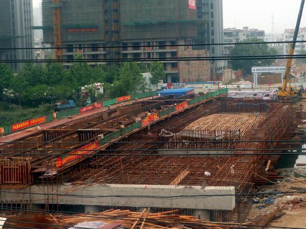 宋斗灣路工程跨南淝河橋在3月30日左半幅鋼管樁打設完畢后,就開始著手進行貝雷架和支架搭設作業(yè)。在左半幅支架搭設、模板鋪裝和鋼筋安裝施工的同時,跨南淝河橋右半幅的鋼管樁打設作業(yè)和支架搭設作業(yè)也初步完工。至此,宋斗灣路工程跨南淝河橋的上部結構的支架搭設基本完工。下一步,箱梁內膜安裝結束后,項目部將組織橋梁主體混凝土澆注工作。