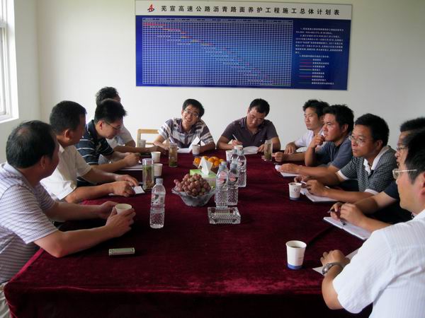 結束了對前后場的現場視察后,曹部長一行在項目部會議室召開了工作座談會議。會上交投集團養護部曹部長、界阜蚌改建辦張主任、蕪宣管理處養護部張部長、駐地辦劉組長作為代表分別就目前施工中質量控制的要點以及施工工序中需注意的幾個方面做了發言,并就此進行了深入的交流與探討。