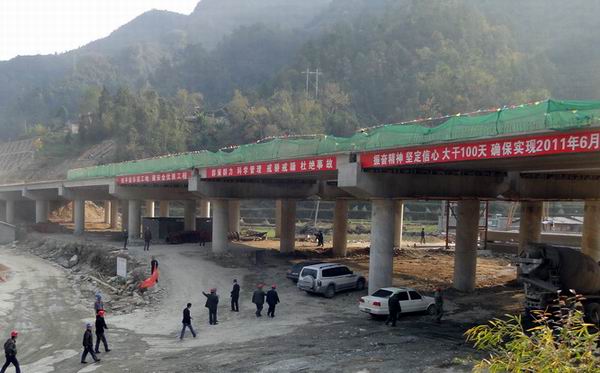 王家溝大橋設計為8孔20米,橋梁全長170.08米,共8跨28根立柱,144塊梁板,上部構造為20米跨徑預應力空心板,下部構造橋墩為柱式敦、樁基礎,橋臺為u型臺擴基、柱式臺樁基。從2009年12月份開始樁基挖空施工,克服了挖孔巖石堅硬、反復滲水的地質困難,經受住7月15日特大洪水和8月6日龍卷風考驗,順利于6月份完成立柱施工,8月開始進行橋臺施工,9月6日開始梁板架設。在梁板架設的同時,橋面連接施工也已經展開,截止11月8日,橋面連接施工只剩下最后一跨。