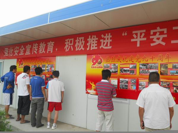 《黨旗永遠(yuǎn)飄揚(yáng)》系列圖片展用大量翔實(shí)的資料照片生動(dòng)地展現(xiàn)了中國(guó)共產(chǎn)黨90年來的輝煌成就。大家一邊觀看一邊激動(dòng)地議論和感慨:“有了共產(chǎn)黨,才有了中國(guó)翻天覆地的變化,才有了中國(guó)繁榮富強(qiáng)的今天”。通過參觀,更加激發(fā)了員工們對(duì)中國(guó)共產(chǎn)黨的熱愛之情,堅(jiān)定了大家的理想信念;激勵(lì)了項(xiàng)目一線員工更加積極的投入到蚌淮高速的施工建設(shè),為實(shí)現(xiàn)公司的“十二五”戰(zhàn)略規(guī)劃做出自己應(yīng)有的貢獻(xiàn)。晚上7點(diǎn),在項(xiàng)目操場(chǎng)上,露天展映的抗日戰(zhàn)爭(zhēng)影片有紅色經(jīng)典影片《七七事變》、《狼牙山五壯士》、《地道戰(zhàn)》,讓大家又受了一次紅色精神的洗禮。