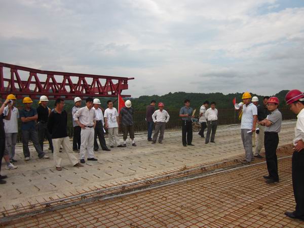 下午15:30,在大廣高速龍楊段項目辦、高駐辦相關領導帶領下,全線各高駐辦、施工單位主要負責人徒步參觀了我標江口大橋施工現場。實地考察中,我標項目經理羅權針對水混凝土橋面鋪裝施工情況作了簡要介紹,并就部分施工細節問題與觀摩團進行了深入交流。