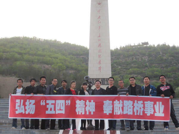 為不影響施工生產,活動選擇在下午6點進行。項目經理帶領全體青年團員前往吳起縣中央紅軍與陜北紅軍會師地吳起縣中央紅軍革命紀念園,接受紅色教育。項目部全體青年團員順著革命先輩踏過的臺梯,一步步的登上中央紅軍長征勝利紀念碑的腳下,共同拉著“弘揚五四精神奉獻路橋事業(yè)”的宣傳標語進行合影留念。